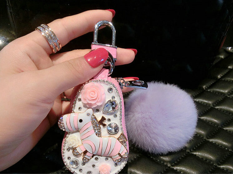 Luxurious Universal Crystal Genuine Leather Auto Key Bags White fur Ball Key Chain - Pink This item will be shipped from China