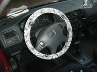 I just bought a new car and decided to retire my old furry steering wheel cover. I soon found that it's impossible to find cool covers anymore. While in my closet I found a scrap of fabric I used to make a really cool lime zebra skirt a few years ago. I light bulb went off in my head and I ended up with the most awesome car decoration ever! After that I found another scrap of steampunky clock fabric to do the tutorial. Enjoy!