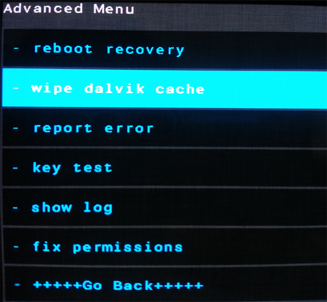 Step 8 - Now this is optional, but it is recommended to perform a wipe of your dalvik cache as well. You will not get into boot loops or any other errors. From CWM recovery, go to 'advanced' and then select "wipe dalvik cache".