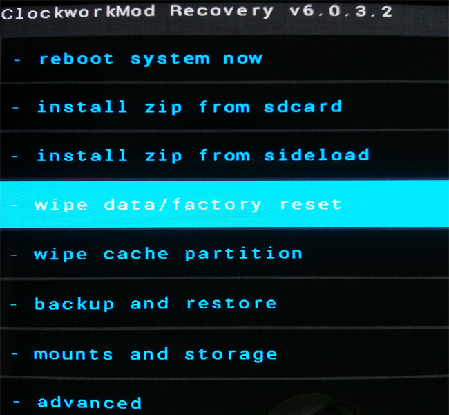Step 6 - Once you are in ClockworkMod Recovery, select perform a full data wipe by selecting "wipe data/factory reset" as shown below. Use the Power button to select everything while in the Recovery Mode.