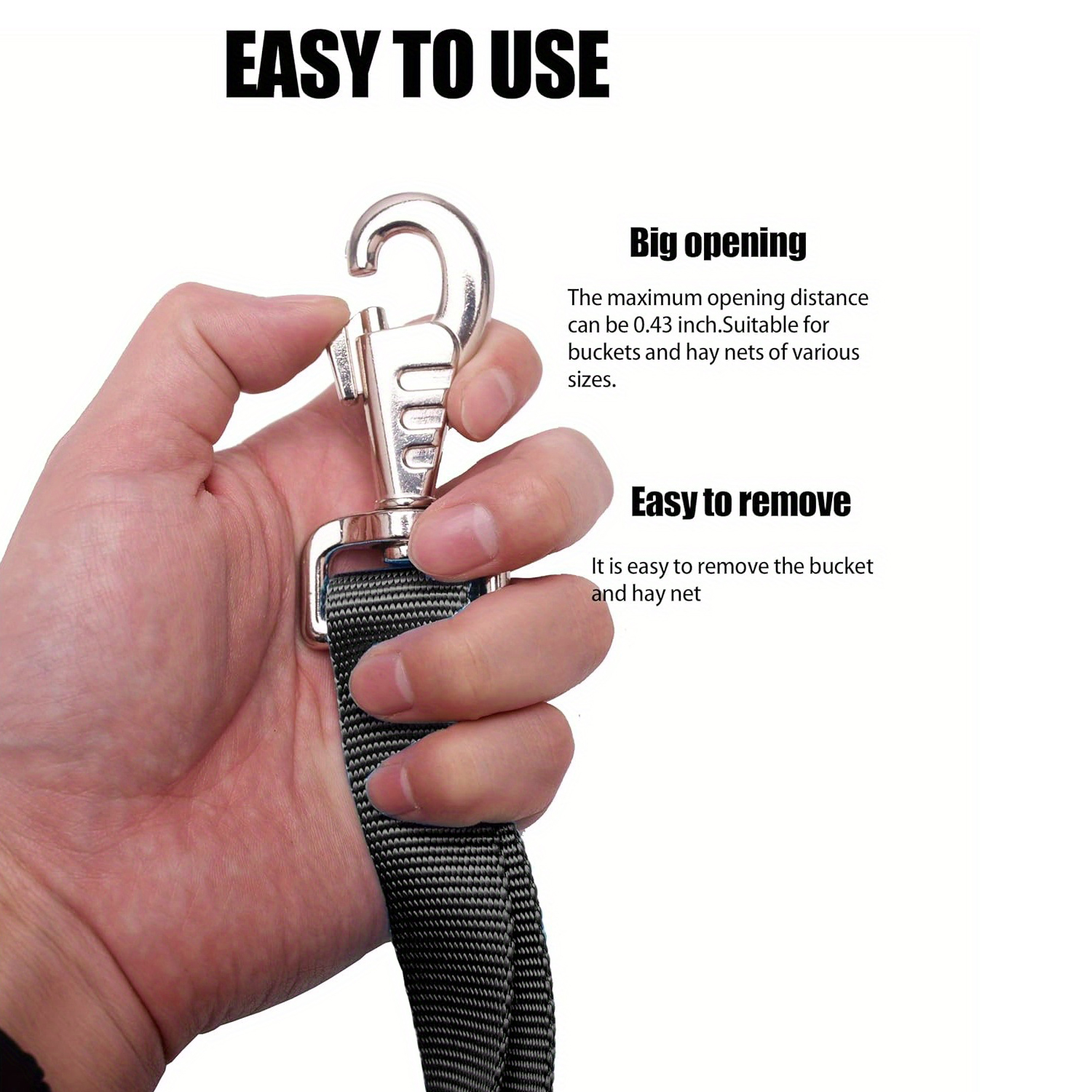 3.) Easy to use: Simply run strap around fence post and attach snap to bucket's handle,great for hanging hay nets, water buckets, feeders and horse tack,half twist loop helps keep the bucket hanging straight.