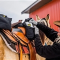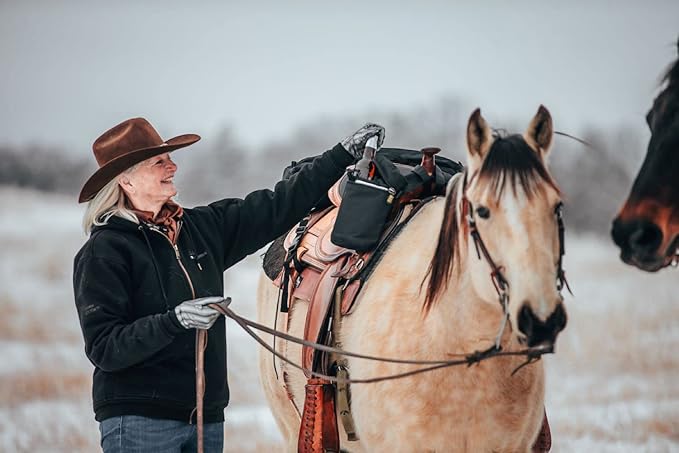4.) onvenient Handling and Versatile Straps: Designed with your convenience in mind, the saddle bags feature an easy-padded handle for effortless loading, unloading, and cleaning. The generously sized straps can securely hold a bedroll or rain gear and come equipped with an easy snap closure for a hassle-free riding experience.